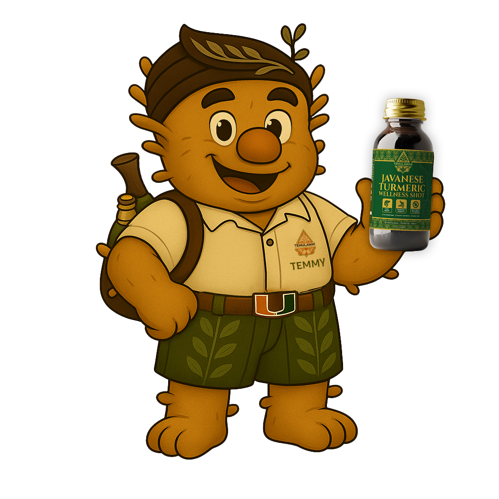In the mystical world of Jamu tradition, Temmy is the beloved spirit guardian who watches over the precious turmeric roots. This friendly guide embodies the ancient wisdom and healing energy that flows through every product we create.
